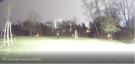 V tomto scénáři kamera směřuje do míst s nízkým osvětlením (prakticky do tmy). Při 8 FPS a maximálním zisku dokáže zachytit základní obrys postavy.